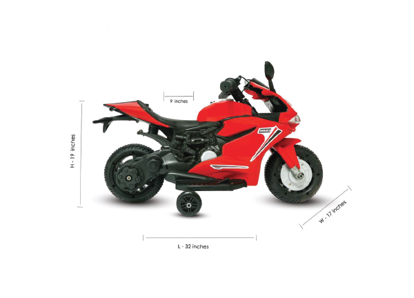 – For Children Age 2-5 Years– 6V Battery Operated Heavybike– Hand Accelerator– Pedal Brake– Backward & Forward Option– Sporty Design– LED HeadLamp– MP3 Player (USB & Aux Audio Input)– Colours: Red, White, Blue